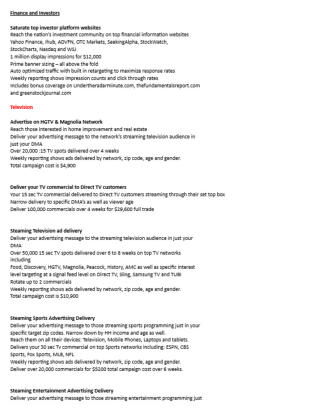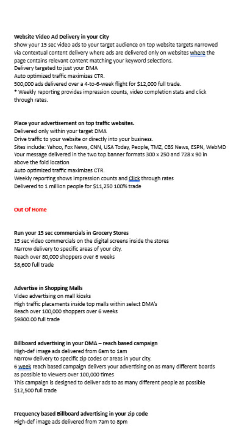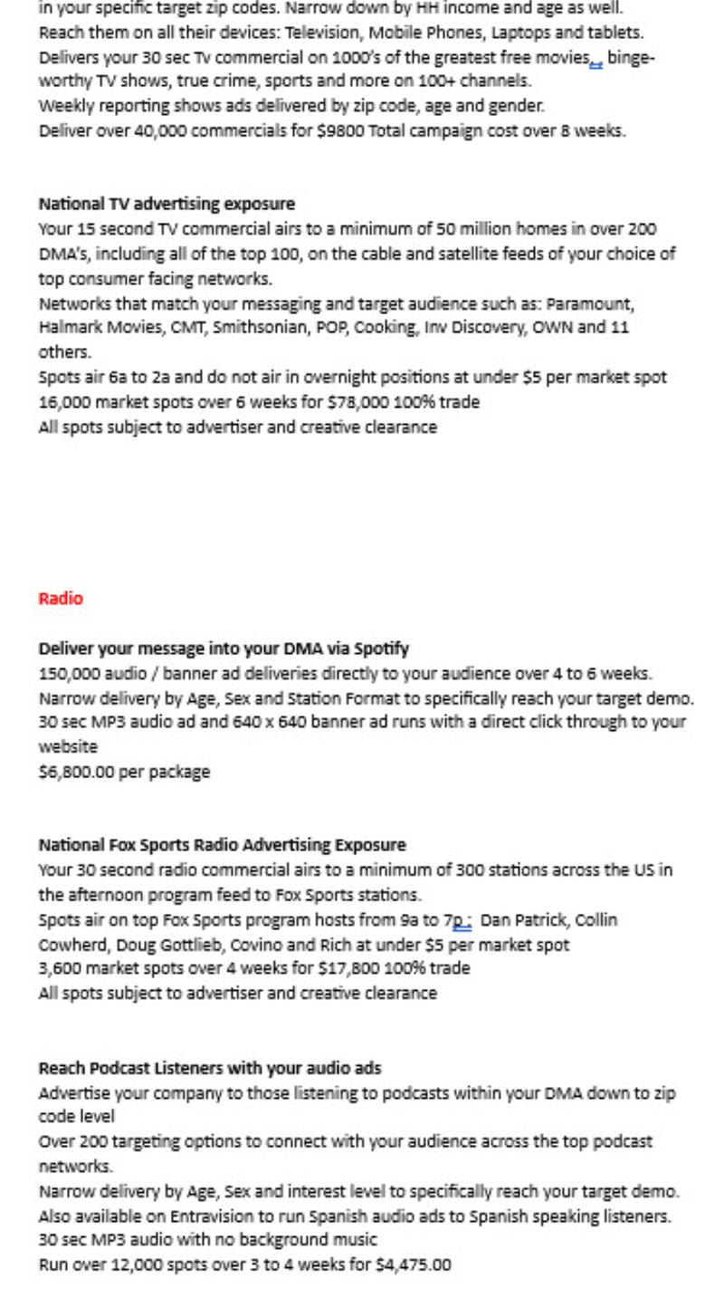 The following is a current list of media placement opportunities available to be sold.This is a basic list of availability. The backbone here is a full service direct response ad agency so if you are looking for a media placement opportunity not shown Please contact me. Please click the page image below to expand or on the PDF image to download the latest avails list